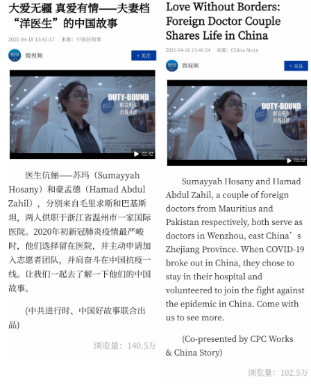 On Apr. 18, "Love Without Borders: Foreign Doctor Couple Shares Life in China”, a narrative short video about a foreign couple’s life and fight against the pandemic in Wenzhou, attracted the attention of many CPC central media, and was recommended by them to the whole world. The cumulative reading volume in just two days has exceeded 5 million.