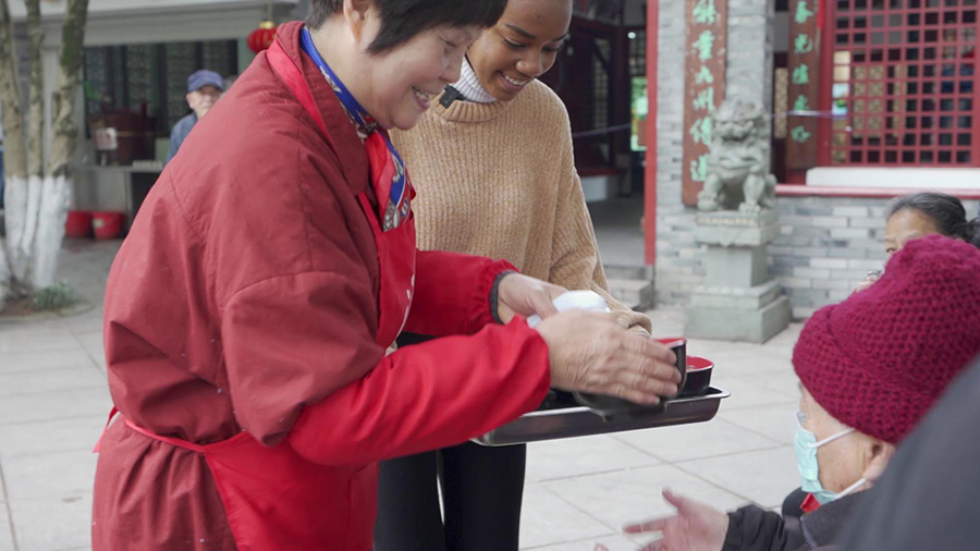 In the early morning, following the film crew, Jeniffer came to the Hongriting, which is a charity landmark in Lucheng District, Wenzhou. Sun Lanxiang, the person in charge of Hongriting, gave an introduction of Laba Festival to Jeniffer, then invited her to cook the Laba porridge and serve the porridge to passers-by. Jeniffer said,“After this experience, I love Wenzhou more. It is a city of love.”