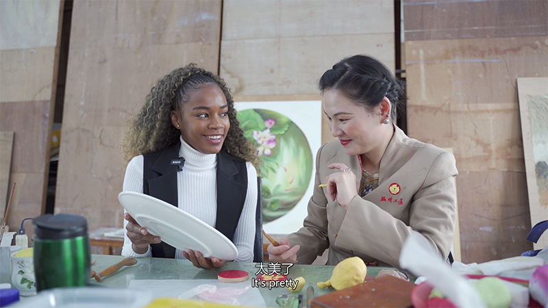 After appreciating the colorful Ou sculpture works, Jenifer experienced making Ou sculpture work by her own hands. Generally speaking, the production of Ou sculpture work is divided into several steps: drawing, coloring, lacquering and cleaning. Numerous Ou sculpture artisans who tirelessly repeat these steps have left such exquisite Ou sculpture works to the world. Mr. Zhou said that our present Ou sculpture inheritors should not only protect China's profound culture, inherit the traditional arts and retain their value, but also keep pace with the times, create more Ou sculpture works, and promote this art to the whole world.