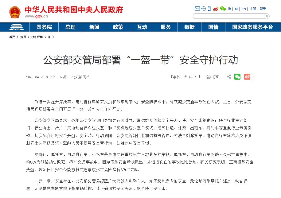 Recently, the Traffic Management Bureau of the Ministry of Public Security issued a notice that from June 1st, 2020, the safety guard operation named "One Helmet and One Belt" will be carried out across the country.