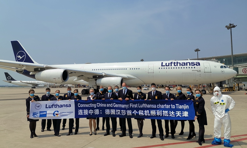 A flight carrying German business travelers from Frankfurt, jointly arranged by German Chamber of Commerce in China, German diplomatic missions, and Lufthansa airlines, landed in Tianjin at 11:45 am on Saturday. Photo: Courtesy of Lufthansa Group The "Fast-Track Access" refers to the system that Chinese government provides expedited border-entry procedures to those who come to China for important business, logistics, production and technical services. At present, the "Fast-Track Access" has been established with South Korea, Germany, Singapore and other countries. On the premise of ensuring COVID-19 prevention and control, China will continue to discuss with other countries over the world to establish the "Fast-Track Access".