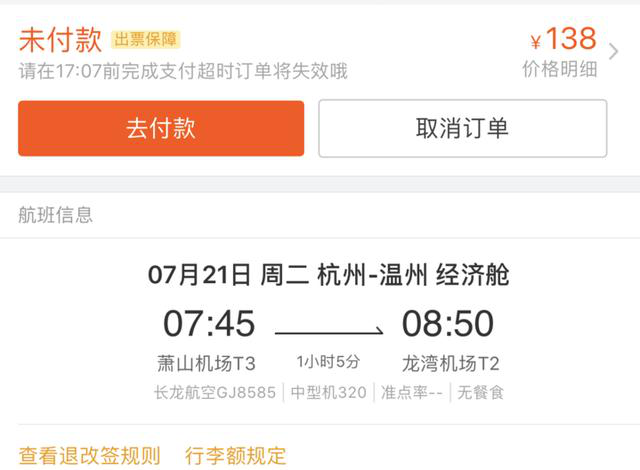 01 Flight Time The maiden flight from Hangzhou took off at 7:45 and was expected to arrive at Wenzhou Longwan International Airport at 8:50. The full flight is 1 hour and 05 minutes, and the air time is only 35 minutes. The maiden flight ticket is 88 yuan, plus 50 yuan for the airport construction fee. So the total airfare is 138 yuan.