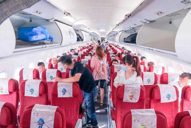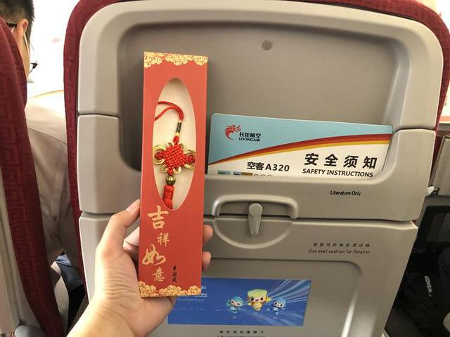 Furthermore, small gifts were given to passengers on the maiden flight. Each person got a bottle of mineral water, a small peach crisp biscuit and a Chinese knot for the maiden flight souvenir.
