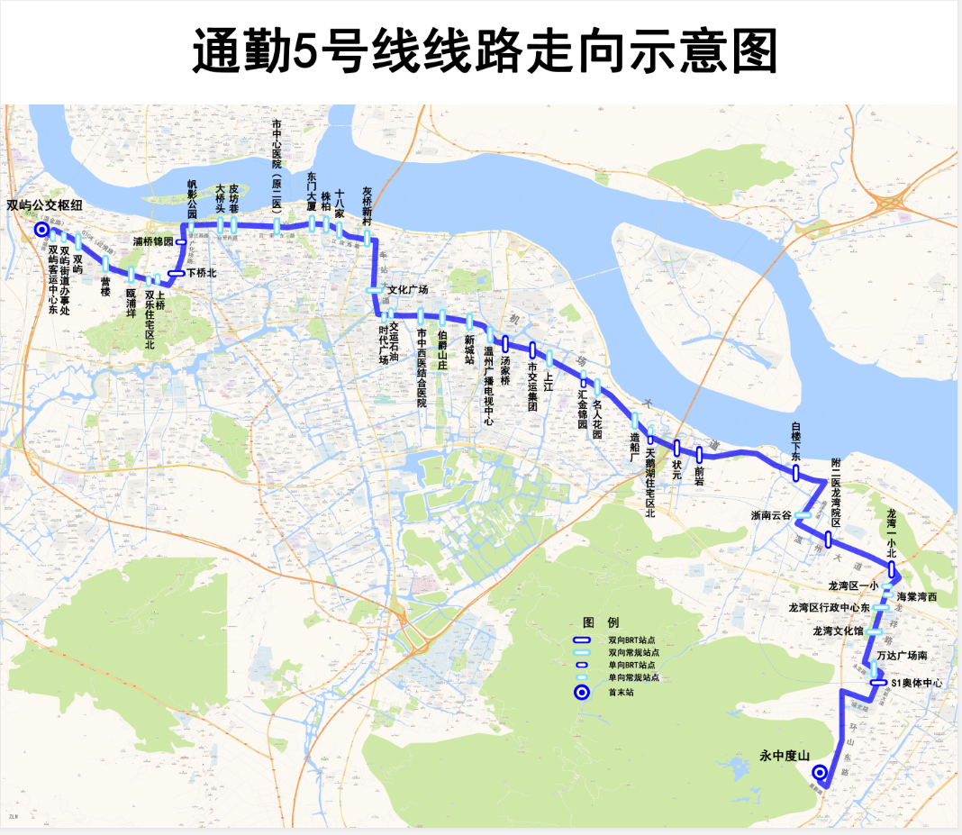 Route: It follows Shuangyu Bus Hub, Xincheng Passenger Terminal, the 3 major general hospitals (Wenzhou Central Hospital, Wenzhou hospital of Traditional Chinese & Western Medicine, Longwan Hospital of the Second Affiliated Hospital) and the large commercial centers such as Times Square and Wanda Plaza, passes through Longwan District Administration Center and the S1 Olympic Sports Center, then finally effectively connects with BRT Line 1 and Rail Transit Line S1.