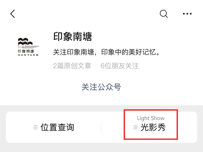 You must follow the Wechat official account "印象南塘" , then click it and enter the light show ticket purchase program to buy tickets.