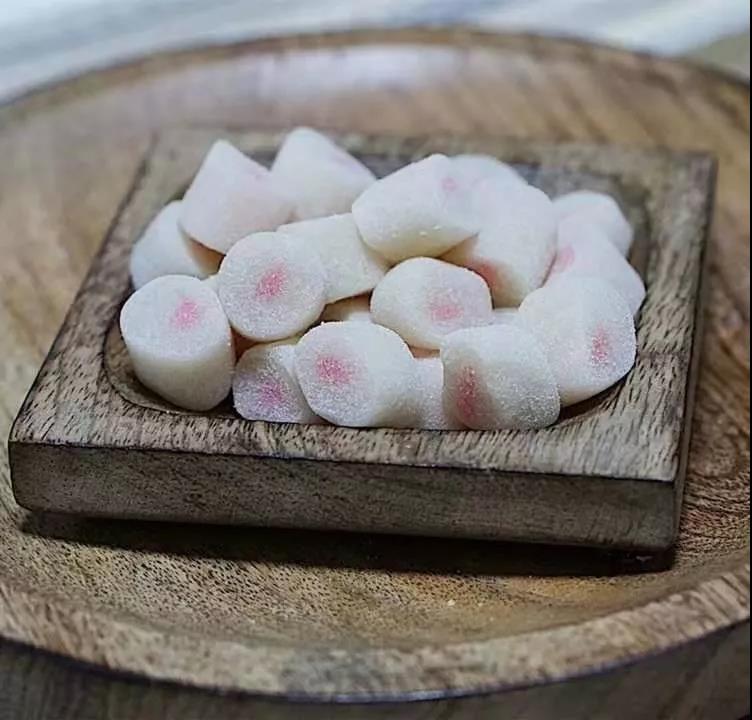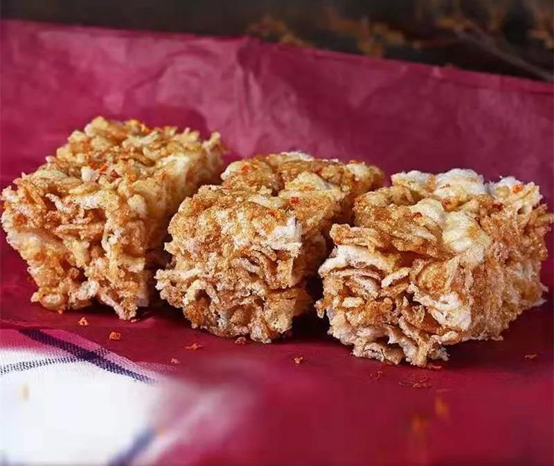 Furong candy, also known as Wenzhou Sachima, is made by concocting white flour and eggs into a ball, pressing it into a uniform and thin sheet jelly. Then frying the sheet jelly into flower-shaped slice with lard oil, adding sugar with syrup. Next, sprinkle Osmanthus on it and cut it into pieces.