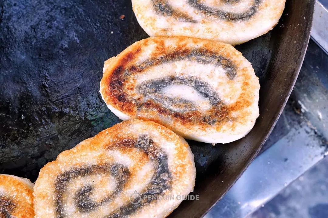 Lard cake is a thin glutinous rice ball made of glutinous rice and white sugar. It is fried in lard until its skin gets crispy. When eating, people always sprinkle some white sugar and wrap it with gardenia leaves. It tastes oily but not greasy. With its simplicity and quaintness, lark cakes have been loved by generations of Wenzhou people.