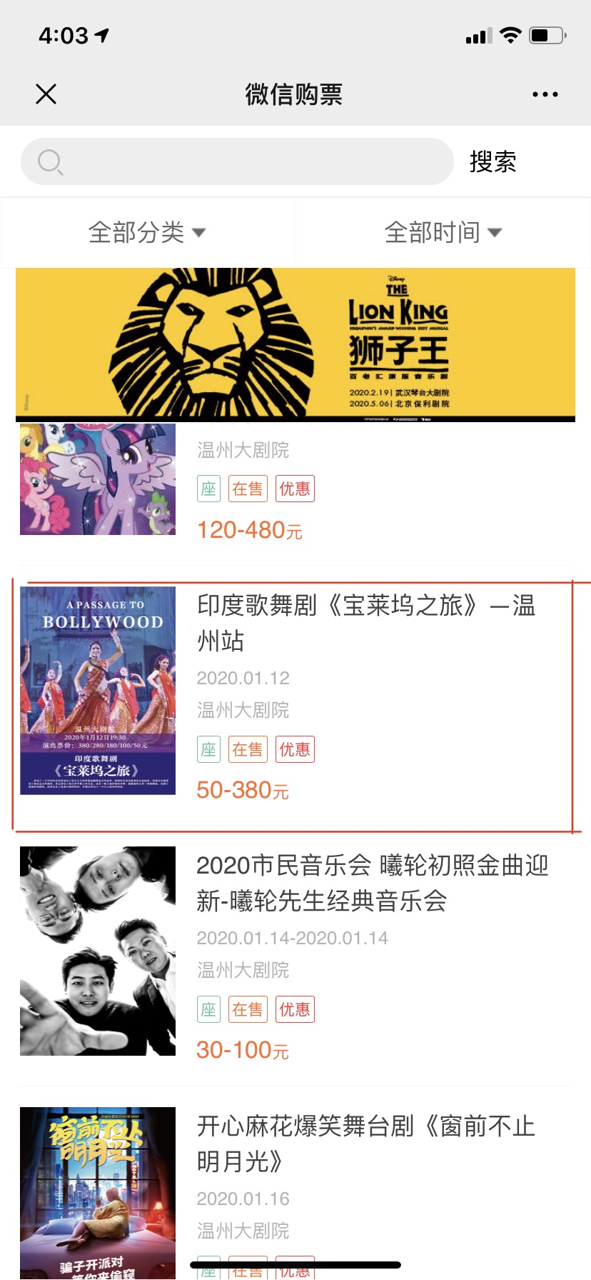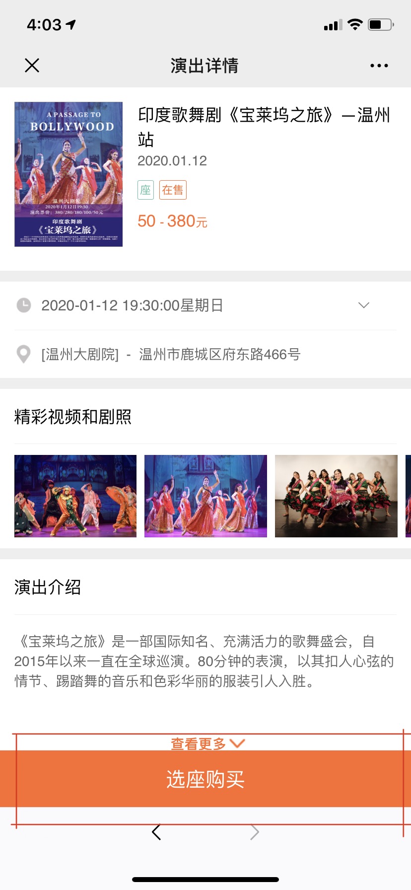 and select “票务中心“-”我要购票“, then click on “印度歌舞剧《宝莱坞之旅》温州站” to buy tickets.