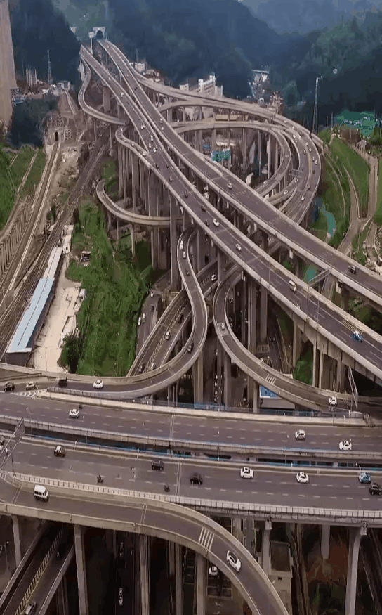 This viaduct rises straight from the ground with a maximum of 55 metersdrop (equivalent to a height of 18 storeys). There are 5-storeys cloverleaf interchange, 11 ramps, 8 exits, winding like a roller coaster.