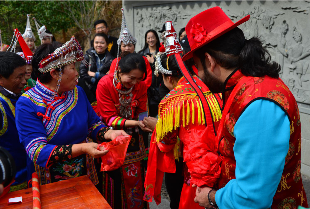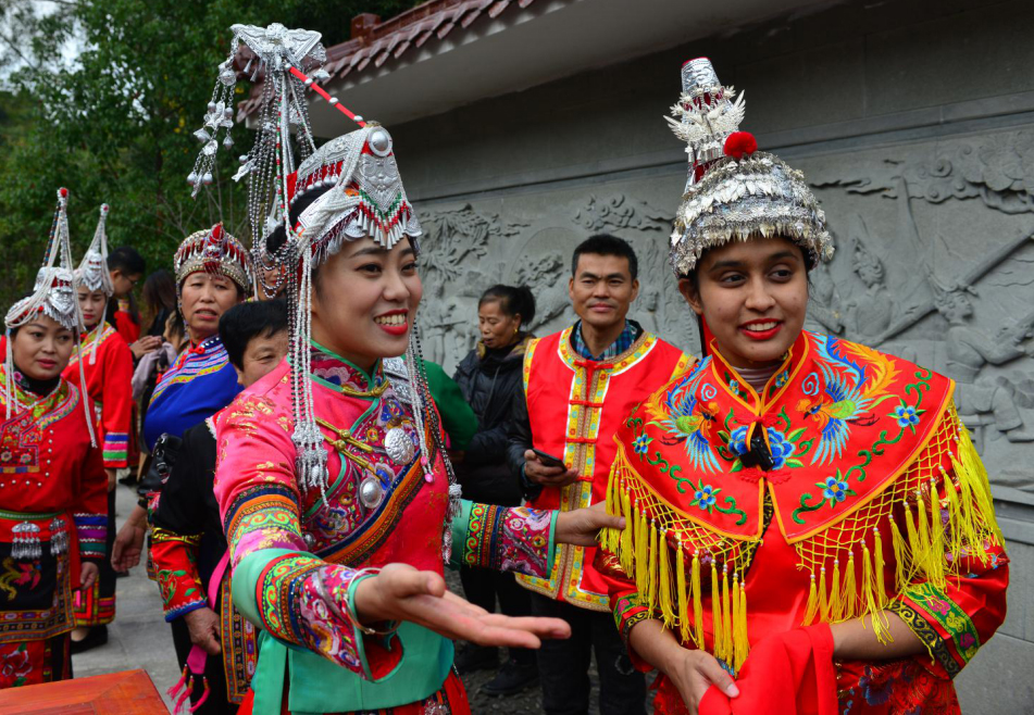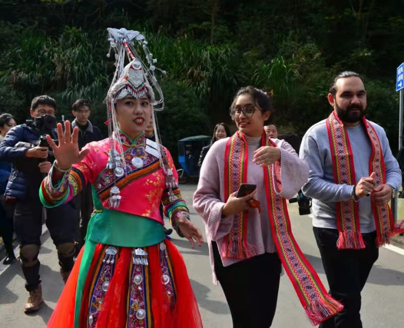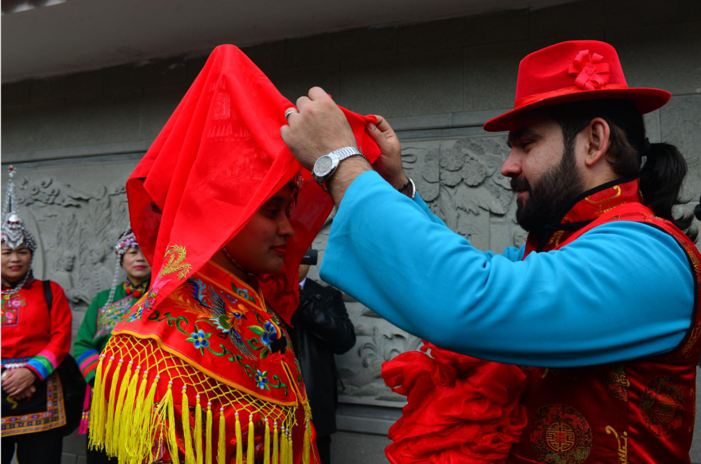 It is reported that Fengyang “She” Minority Nationality Township is located in the mountainous area in the southeastern part of Cangnan County. It is the ethnic township with the highest proportion of ethnic minorities in Zhejiang province. It has a long history of “She” culture, strong regional customs and rich tourism resources. In this experience event of traditional “She” wedding, the festive red sedan chair and those different-styles’ dowries made Sumayyah from Mauritius and Hao Mengde from Pakistan full of curiosity. The couple also wore traditional wedding costumes of “She” people.