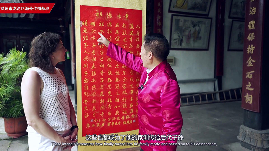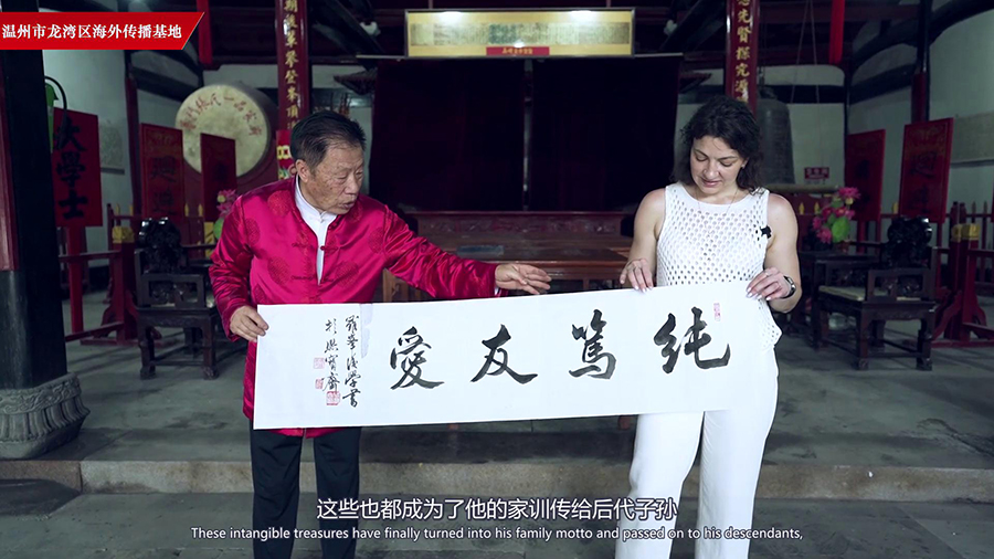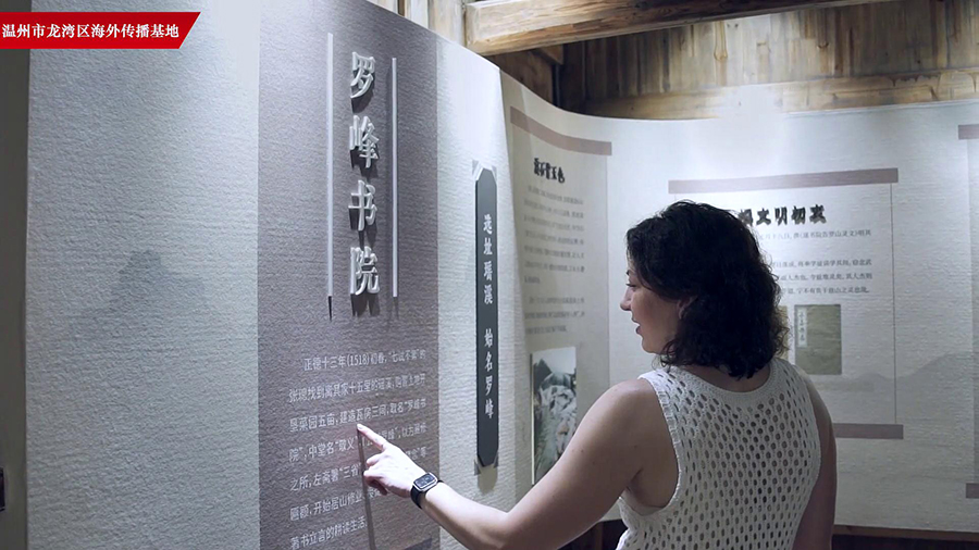 This is an one-day cultural trip in Longwan, Wenzhou for Alexandra, the foreign anchor of Wenzhou Overseas Media Center. This time, she walked into Longwan, Wenzhou, to explore the story of Zhang Cong, a cultural celebrity from 500 years ago. She read the legend of Zhang Cong's life at Luofeng Academy (now Longwan Yaoxi Zhenyi Academy) founded by Zhang Cong, and listened to Mr. Zhang Weigeng, the descendant of Zhang Cong, to narrate his family rules passed down from generation to generation in Zhang Cong Ancestral Hall.
