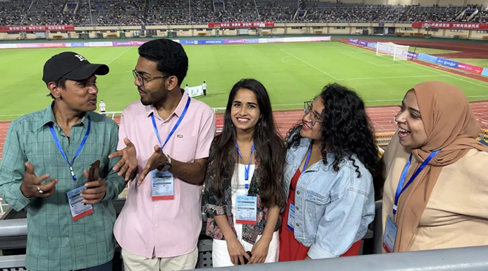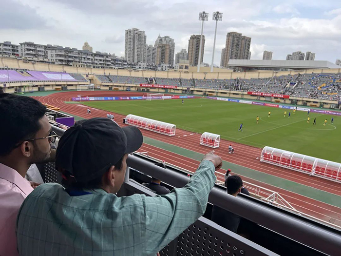On May 27, Wenzhou Overseas Media Center and College of International Education, Wenzhou University jointly invited 25 international friends who work and live in Wenzhou, and international students from many Asian countries, to visit Wenzhou Sports Center and have an experience of being Asian Games journalists. Some international friends interviewed the football players in English.
