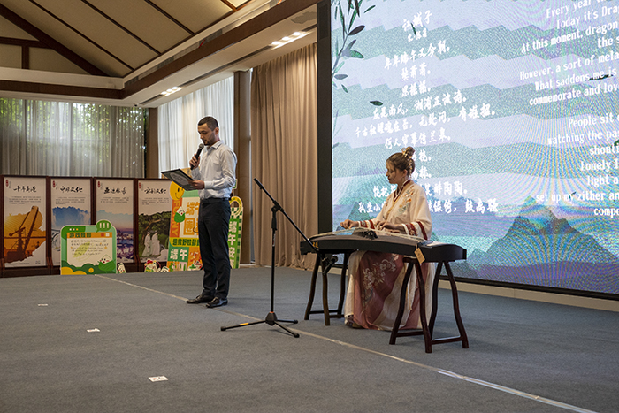 On June 20, a Chinese &foreign cultural exchange activity themed in "Graceful Dragon Boat Festival" was held at Wenzhou Overseas Media Center. The activity showcased the intrinsic beauty of traditional Chinese culture through guqin performance, tea performance and cheongsam show. The foreign friends also played Chinese zither and recited ancient poems, giving everyone at the scene a wonderful enjoyment featuring the blend of Chinese and foreign cultures.