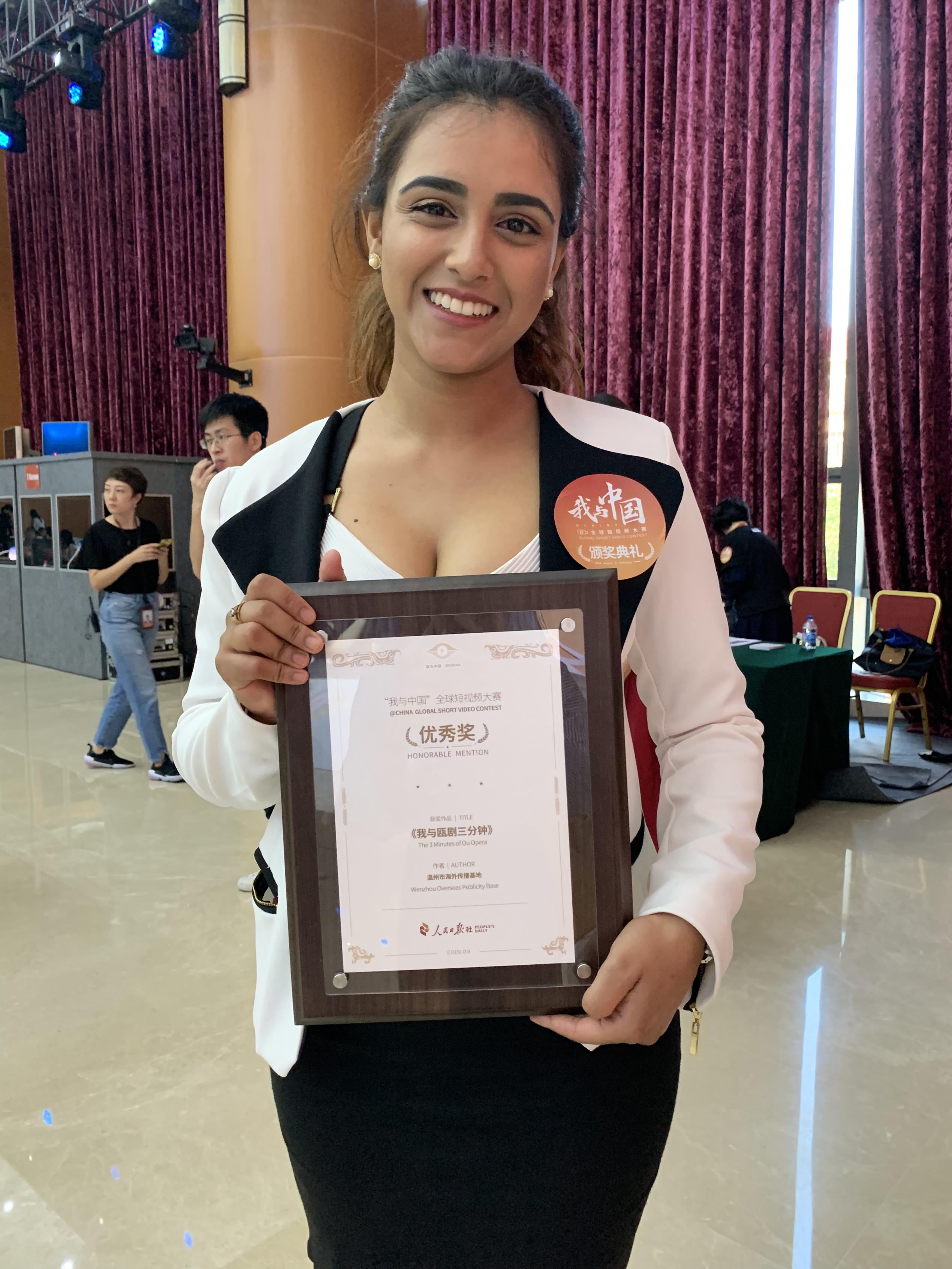 The English video "The 3 minutes I spent with Ou opera" created by column "Foreigners Spotlight" of media “WenzhouDaily” has stood out from the global 430,000 works and won the Excellence Award of "@China" Global Short Video Competition sponsored by press outlet “People's Daily”. Recently, the programs main staff and video actress, Michaela, an overseas communicator from South Africa, came to Beijing to attend the award ceremony.