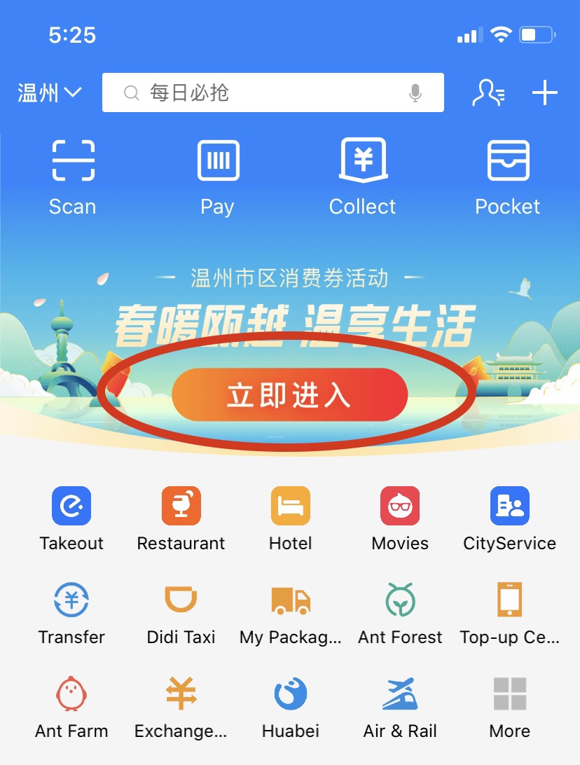 On the Alipay homepage, enter the "Meeting the Warm Spring of Ouyue· Enjoying the Happy Life in Wenzhou (春暖瓯越·温享生活)" to apply for the consumption coupon package.