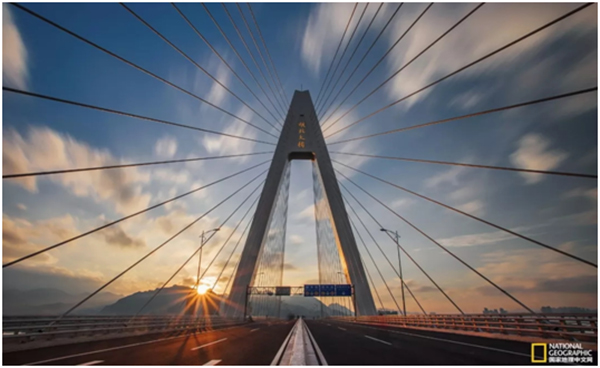 Looking north from downtown, the Ouyue bridge is like a dragon swimming over the immense Oujiang river and wriggling its way to the mountains. A Bridge Spanning across East & West, Three Rivers Integrated into One