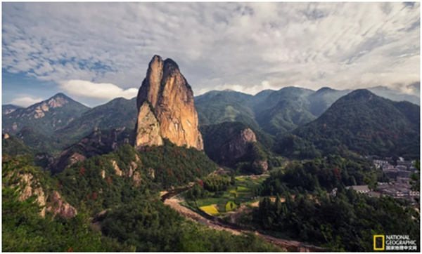 Shiguiyan Rock, called as "the highest pillar in Southern Zhejiang" with its height of 306 meters, is completely isolated. In the tectonic setting of the development of geological fractures and the uplift of the earth's crust, the rhyolite volcanic rocks had been eroded by flowing water for a long time, from which this isolated peak had been shaped. Stars Twinkling on The Top of Nanzheng